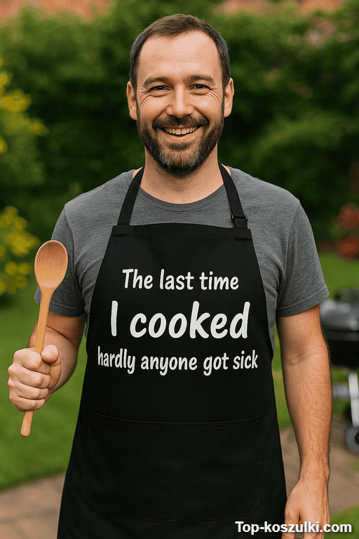 Śmieszny fartuch z tekstem „The last time I cooked hardly anyone got sick” robi robotę szybciej niż przyprawy. Idealny, gdy chcesz gotować z przymrużeniem oka i rozbroić gości już przy wejściu 😄