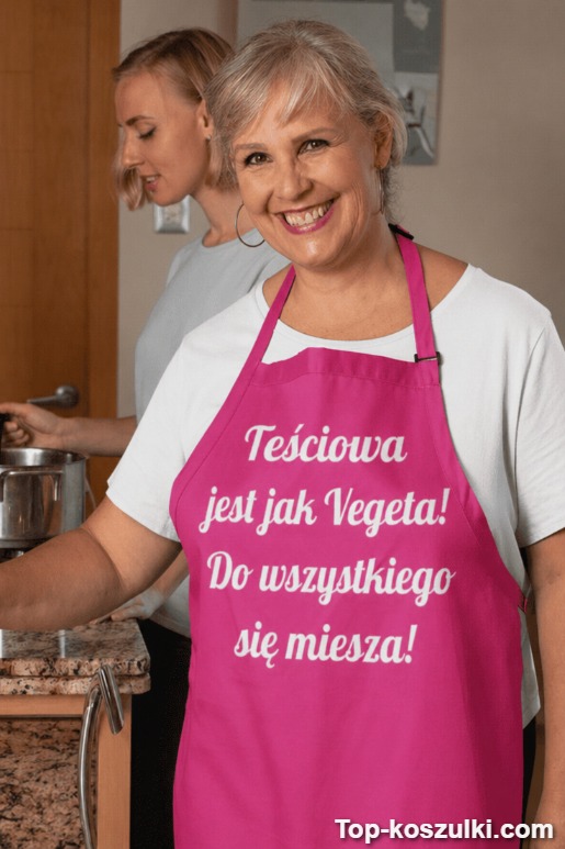 Jeśli celujesz w prezent, który od razu robi klimat w kuchni, ten fartuch wchodzi jak złoto. Napis „Teściowa jest jak Vegeta! Do wszystkiego się miesza!” mówi wszystko — z przymrużeniem oka, ale celnie 😄